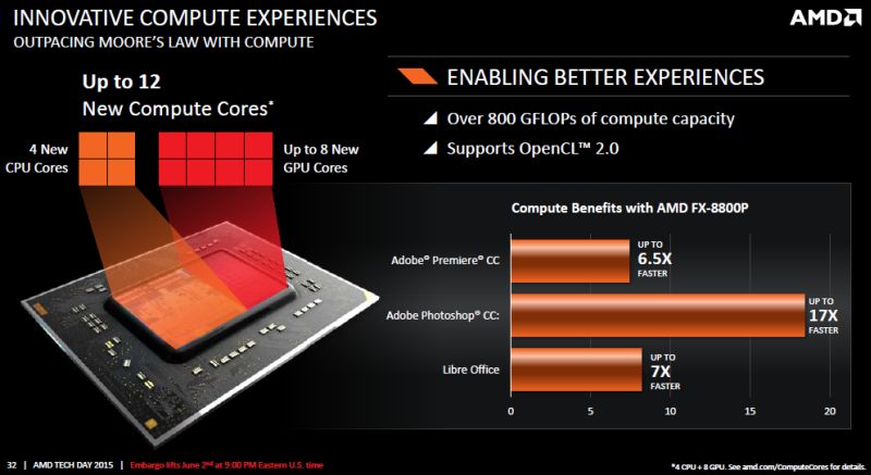 Noul processor foloseste 12 nuclee de calcul – 4 CPU + 8 GPU – bazandu-se pe tehnologia nucleelor „Excavator” si pe arhitectura Graphics Core Next (GCN). AMD sustine ca procesorul dubleaza durata de viata a bateriei, ofera performante de gaming de doua ori mai mari, experiente de procesare inovatoare prin HSA si compatibilitate Windows 10, respectiv DirectX 12.
