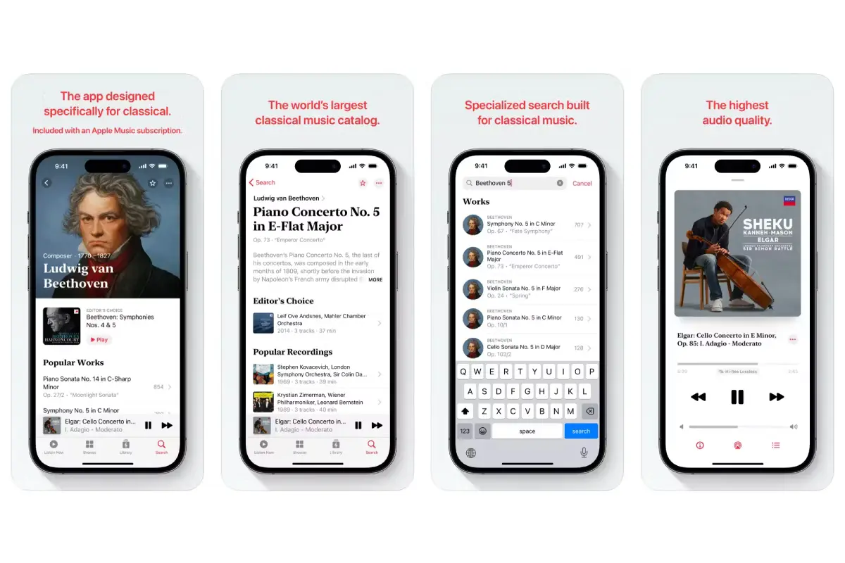 De exemplu, paginile artiștilor se concentrează mai mult pe cele mai bune și mai populare lansări ale acestora decât pe cele mai recente lucrări. În plus, veți găsi un context despre un compozitor și munca lui atunci când îi vedeți profilul în față și în centru. Aplicația include chiar și biografii ale compozitorilor pentru ca tu să afli mai multe despre istoria și viața artistului.