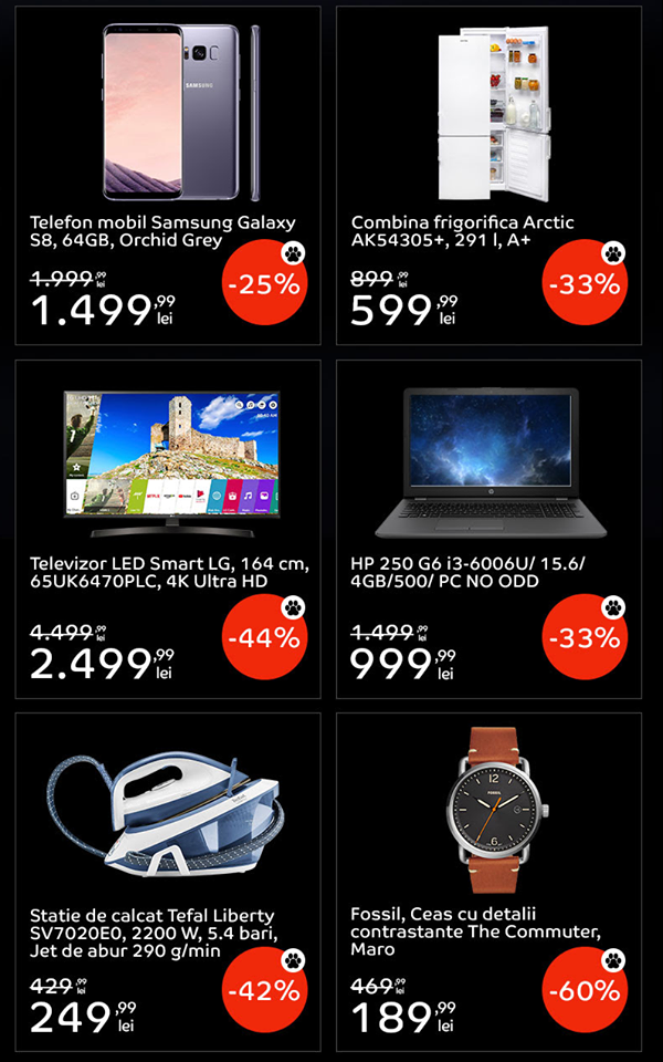 - Televizor LED Smart LG cu diagonala de 164 cm și rezoluție 4K Ultra HD – 2499 lei de la 4499 lei;