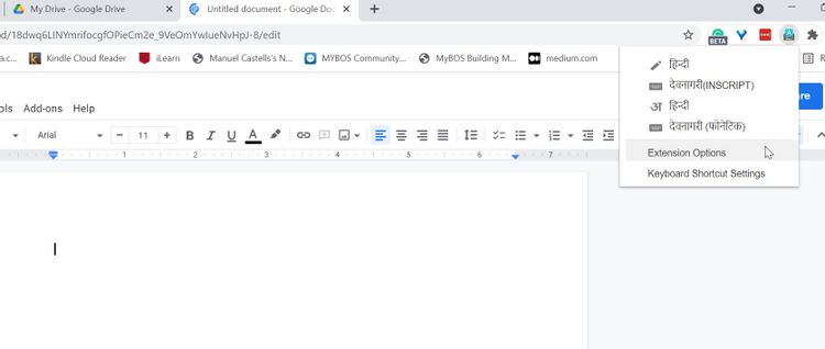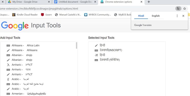 Pentru a deschide Google Input Tools, faceți clic pe pictograma din browserul Chrome, apoi faceți clic pe Opțiuni de extensie. Faceți dublu clic pe instrumentele de introducere pe care doriți să le utilizați și acestea vor fi adăugate la panoul din dreapta.