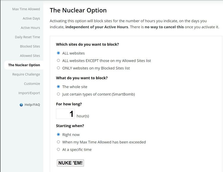 „The Nuclear Option” este utilă atunci când doriți să vă concentrați asupra scrisului pentru o perioadă prelungită. Puteți selecta site-urile, tipul de conținut și durata pe care doriți să le blocați.