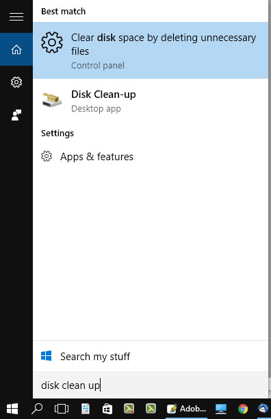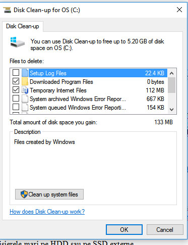 - Primul sfat și cel mai important este să faci puțină curățenie. Merge în search și caută funcția ,,Disk Clean-up’’. Bifează toate căsuțele și apasă enter. Vei scăpa, astfel de o mulțime de temporale și alte fișiere pe care Windows-ul le-a descărcat în timp și a căror validitate a expirat.