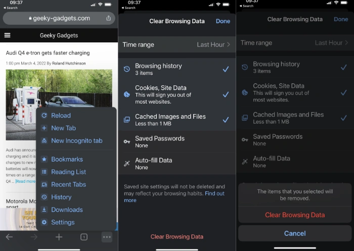 Apoi vi se oferă opțiunile despre ce informații să ștergeți de pe dispozitivul dvs., acestea includ istoricul de navigare, module cookie, date site, imagini și fișiere cache, salvare parole, date de completare automată.