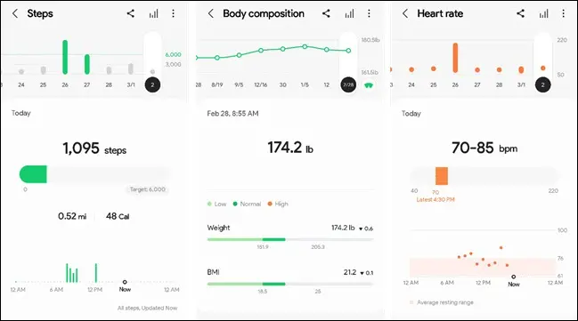Împreună cu pașii, puteți urmări ritmul cardiac (este necesar un dispozitiv compatibil), greutatea și IMC, aportul de calorii, câtă apă beți, zahărul din sânge, tensiunea arterială, ciclul femeilor și somnul.