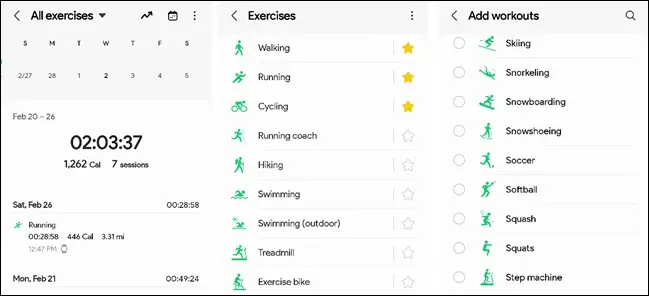 Al doilea tip de urmărire pe care ați dori să-l faceți este urmărirea exercițiilor. Samsung Health poate urmări toate activitățile mari, cum ar fi alergarea, mersul pe jos, ciclismul, înotul etc. Totuși, depășește cu mult activitățile obișnuite.
