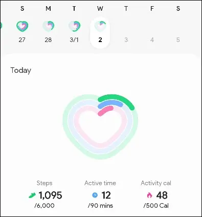 Dacă nu vă pasă atât de mult să vă scufundați în detalii, Samsung Health are și un grafic „Activitate zilnică” foarte prietenos. Graficul în formă de inimă arată pașii tăi, timpul activ și câte calorii ai arse prin activitate.