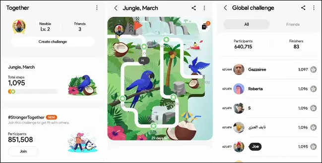 Dacă nu aveți chef să vă implicați prietenii în provocări, vă puteți alătura și provocărilor Samsung Health împreună cu alți utilizatori. Indiferent de tipul de provocare pe care îl alegeți, puteți vedea întotdeauna cum vă descurcați pe un clasament. Și dacă îți plac premiile, există realizări de pus în joc.